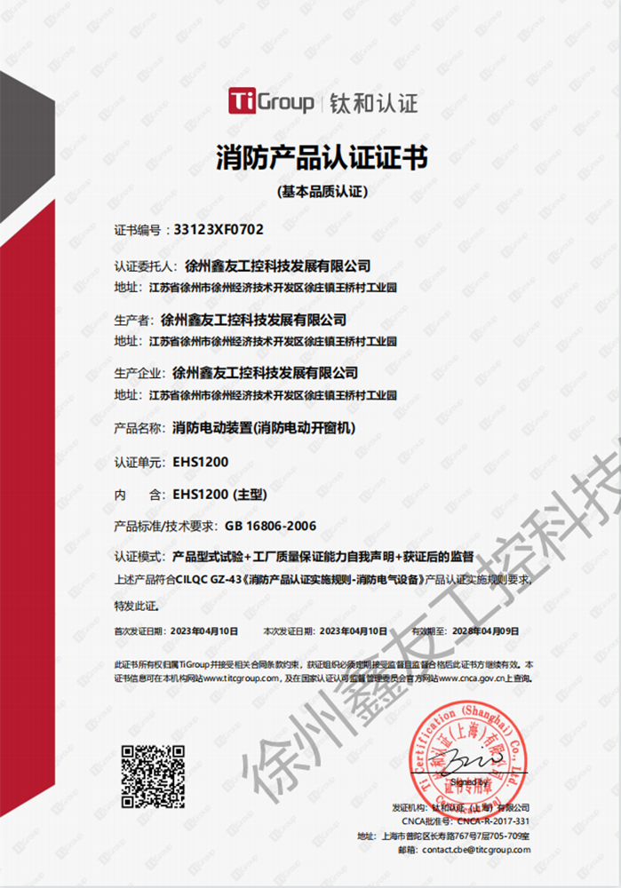 徐州鑫友工控科技發(fā)展有限公司成立于2008年,占地31600平方米,全資子公司:江蘇良紫工程科技有限公司,旗下 有“鑫友”及“MASTER.W主人窗控”兩個品牌系列,公司全面貫徹執(zhí)行IS09001:2015質量管理體系標準,產品順利通過歐盟CE認證和中國***消防電子產品認證,通過可燃性粉塵環(huán)境下、爆炸性環(huán)境下防爆合格產品檢驗。排煙天窗整窗通過***消防產品質量監(jiān)督檢驗中心檢測。先后獲得多項******及榮譽證書。集研發(fā)、加工、生產、制造、銷售、安裝及售后于一體,是一家高起點、研發(fā)能力強的專業(yè)智能化***技術企業(yè)。